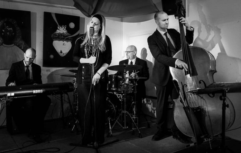 The band features female vocals, saxophone, piano, double bass and drums.