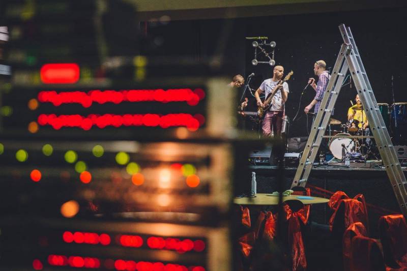 Stage area for 4 piece band including PA, lighting, amps, keyboard, microphones