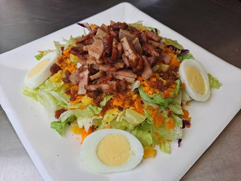 Smoked Brisket, Boiled egg, Bacon Bits, Cheetos, BarBq Chip, Funyons all on a bed of Salad Mix with your choice of Dressing