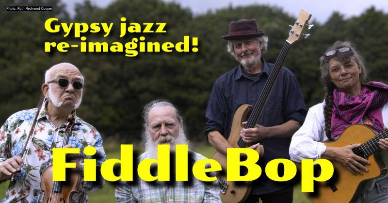 And like the first Gypsy jazz bands — think Django Reinhardt and Stephane Grappelli — FiddleBop's "Gypsy jazz re-imagined" is highly eclectic. In the 1930s, the Quintette du Hot Club de France created amazing music based on current and past pop tunes, traditional Gypsy melodies, their own compositions, even some J S Bach... so FiddleBop's repertoire is similarly wide-ranging. We play Gypsy-flavoured jazz drawn from all of the genre's century-long history. That's get-up-and-dance jazz from the 1920s, 1930s chilli-hot swing, and cool post-bop. Plus jazz-flavoured classic pop, folk-jazz, and our own creations.