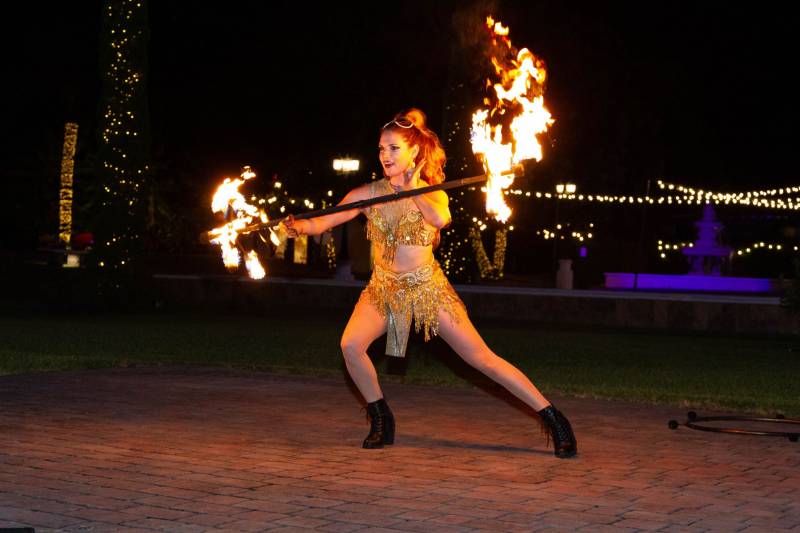 The Fire dancer will start dancing with fire torches then with fire fans, fire hula hoop and dragon if there's enough space.