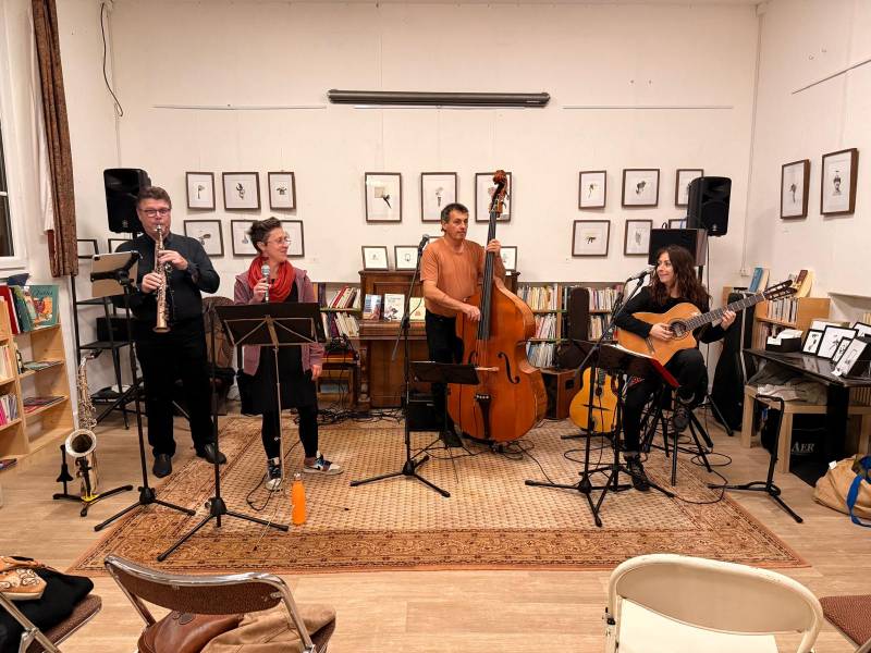 Quatre musiciens, une chanteuse, un saxophoniste, une guitare et une contrebasse jouant du swing, du jazz, de la bossa nova et des chansons françaises et internationales, avec une petite touche manouche...