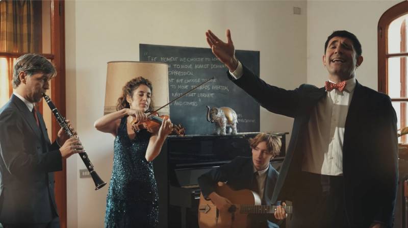 The lineup is flexible: from a voice-and-guitar duo up to a sextet, with the option to add violin, clarinet, and double bass, adapting to every setting in terms of presence and musical exploration.