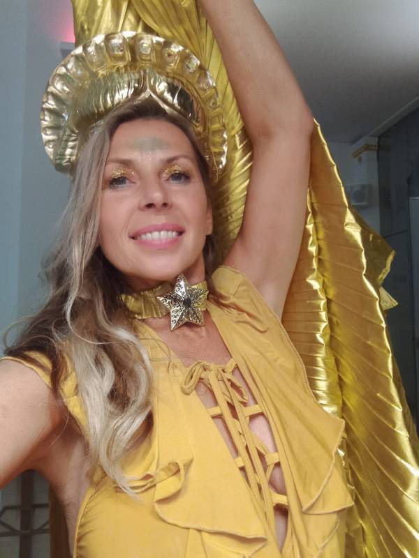 According to the event theme, location and specific topic, I choose the suitable colours, costumes, masks, crowns, hats and accessories (flowers, feathers, crystals, led lamps and artworks and my dancing wings in many colours: (gold, silver, green, pink, transparent). The most important aspect of my performing show is to make people smile, bring joy and happiness and surprise them with creative ideas. I am into spreading good vibes only and try to motivate people to dance, move, be healthy and happy. I use #dance4peace as an ambassador for peace for many NGOs that I collaborate with in peace building.
