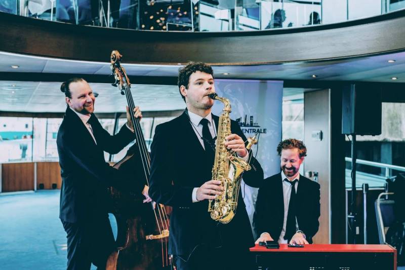This great trio is basically formed by the very popular duo piano + double bass, expanded with swinging saxophone. In fact, this trio has everything that makes beautiful live music: the majestic double bass and the dynamics of piano. And of course... that sultry sound. The great sound of the saxophone, that can fill a room beautifully and can be heard from afar. That look of a saxophonist with that beautiful instrument. This trio has it all. Hence a guaranteed success if you have this trio perform at your party or event.