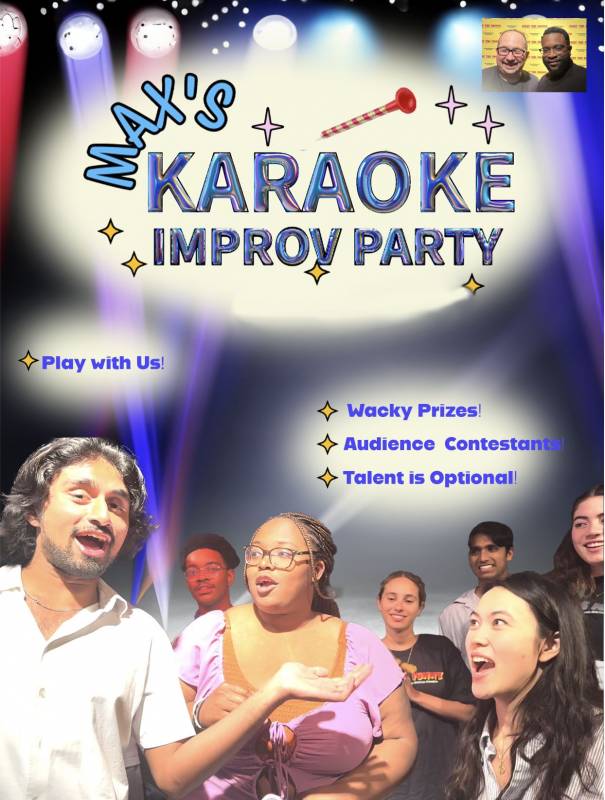 Max's Karaoke Improv Party. These are musical party games. Audience members join in to complete challenges and earn points for ther audience team. Talent is not required, nor is singing. Gag prizes are given out. The event turns into so much fun and laughter.