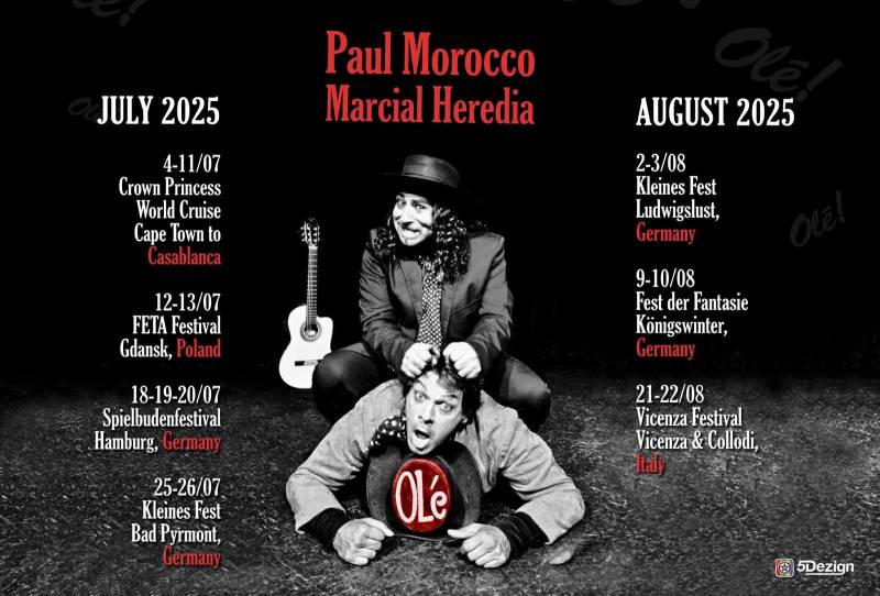 Paul Morocco and „Ole” Comedy Show has been an international award winning phenomenon. Performed in duos or trios, it offers a unique combination of musicality ( guitar, harmonica etc), comedy, spectacular pin-pong and guitar juggling numbers. For over 30 years the audiences have been immersed into magical worlds of flamenco, parodies and intellectual humour in France, Germany, Italy ,USA, the UK, Japan etc.