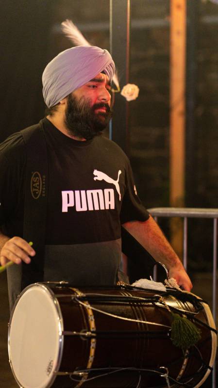 Space for equipment and live performances (e.g., DJ booth or Dhol setup).
