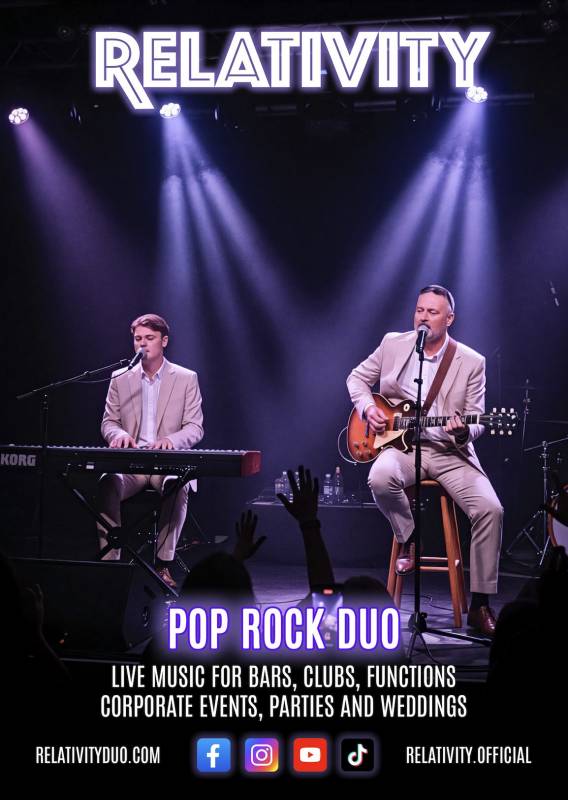 Live Pop/Rock Duo, acoustic style or with backing tracks for a fuller sound. Over 40 years combined experience on the live music scene, Relativity is a brand new venture featuring Ken Evans (The Bohemians, Project X, Moritz, Lucky Strike) and his son Cody who is just entering the live music scene. Piano, synth, guitars-acoustic, electric and bass together with basic percussion and amazingly tight harmony vocals. Perfect for bars, weddings, celebrations, parties with a range of music to suit all events. Mainly pop/rock based however if we have access to sheet music we can play almost any tune required.