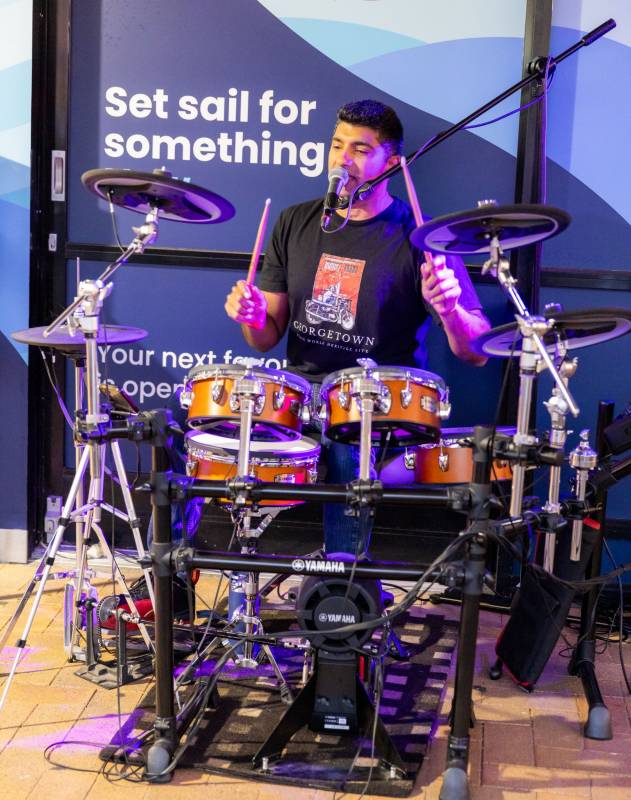 Armed with Yamaha drums, a Shure microphone, and an Electro-Voice PA system, Shake delivers clear, balanced sound for any venue. He also brings the beats as a DJ, using a Numark controller and Serato software to keep the party going long after the live set ends.