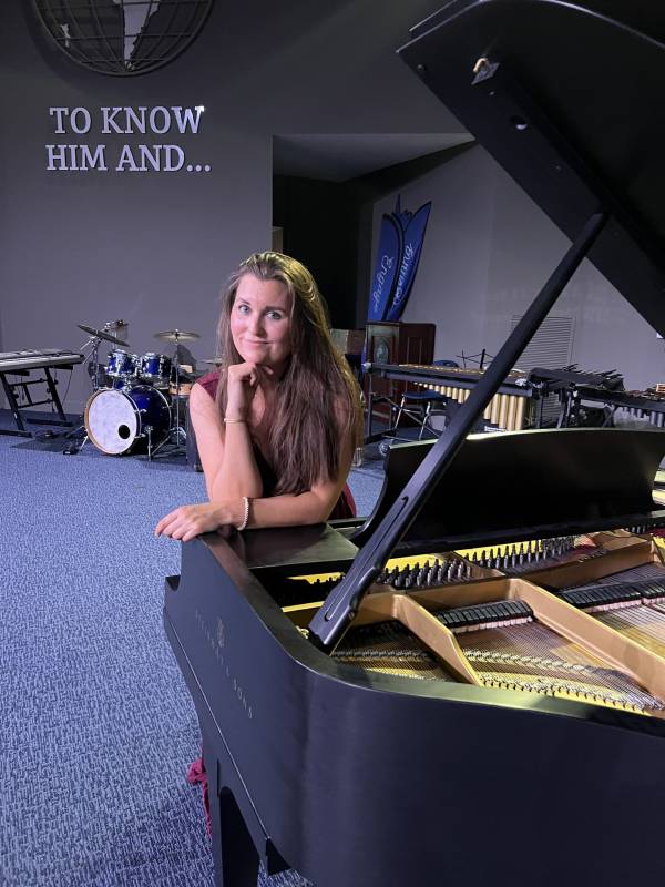Sharon performs on both acoustic grand pianos and professional portable digital instruments, allowing flexibility for indoor and outdoor settings.