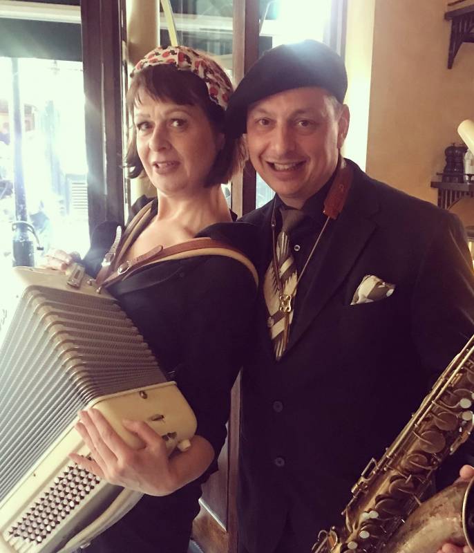 Fifi and Alex can stroll indoor or outdoor playing in the background creating a fabulous 1920's atmosphere or interact with guests playing requests and getting everyone joining in the fun. Alternatively, they can be amplified and Fifi can sing too if required.