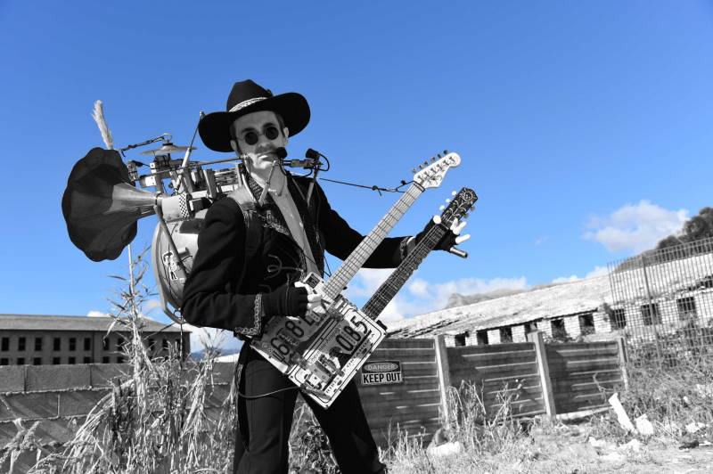Mark Di Giuseppe (The Legendary Straniero)- Trashman Blues is a one man band originally from Chicago (based in Italy) with 32 years of international experience of walking and stage shows! His instruments are all his own inventions built from recycled materials. The double-neck license plate guitar is a showstopper with one normal electric guitar and one special for blues and slide tunings. The drums are a mechanical marvel centered around a bass drum made from a plastic washtub which allow him to play bass drum, snare drum, cymbal, cowbell, woodblock and harmonica while at the same time playing the double-neck guitar. Besides playing all these instruments at the same time it’s his voice that really stands out. Thanks to high tech electronics Mark is able to sing not with only one voice but up to 3 voices in perfect harmony! The music ranges between blues, R&B, soul, 70’s classic rock, 50’s rock & roll, jazz and country. Unique arrangements to songs by Ray Charles, Chuck Berry, Little Richard, John Lee Hooker, Leadbelly, Led Zeppelin, Jimi Hendrix, ZZ Top and the Rolling Stones among many others make for a show that is universally appealing and can get the oldest and the youngest dancing together in the street! Trashman Blues performances are always powerful and energetic yet sometimes beautifully sweet and moving with haunting vocals.